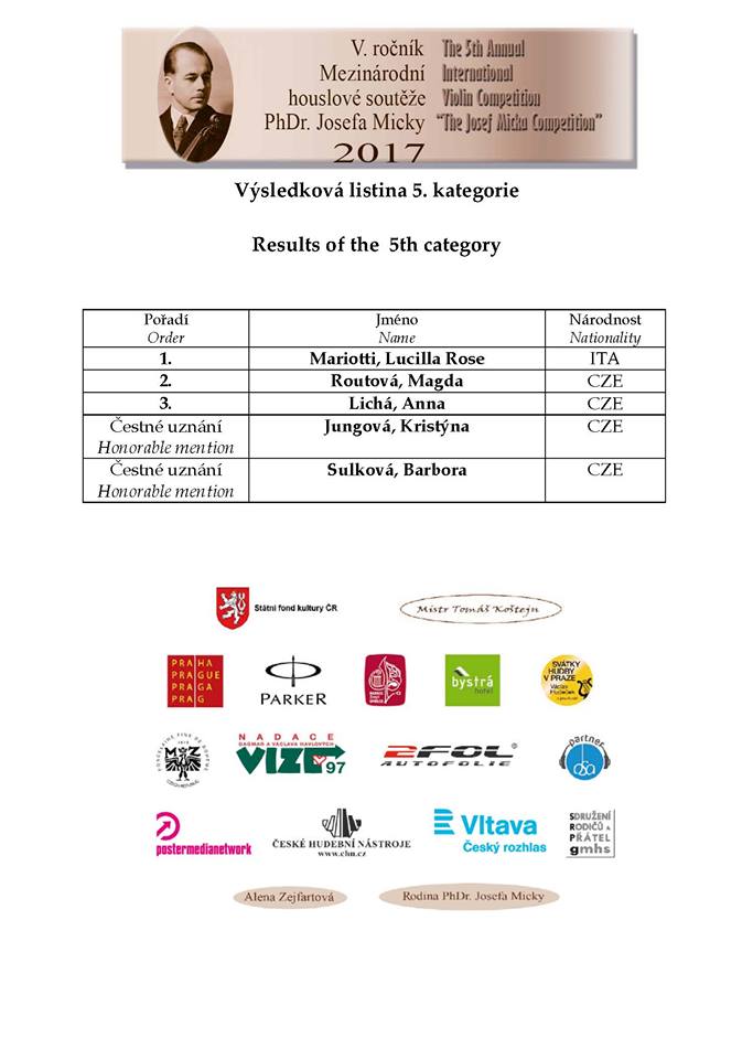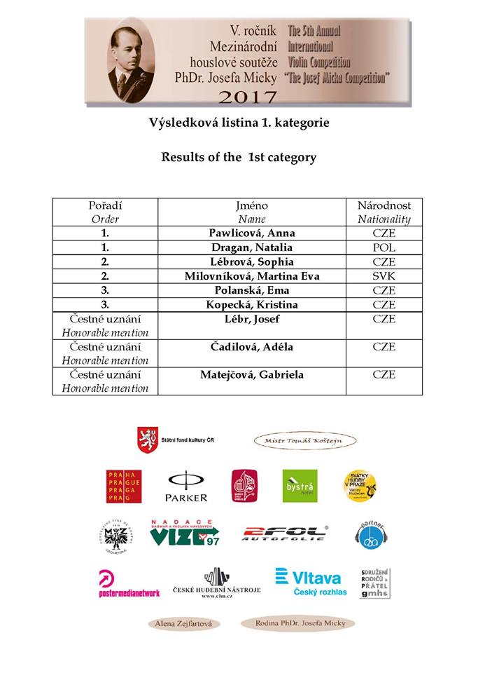 Mezinárodní houslová soutěž J. Micky – výsledky