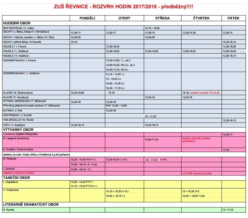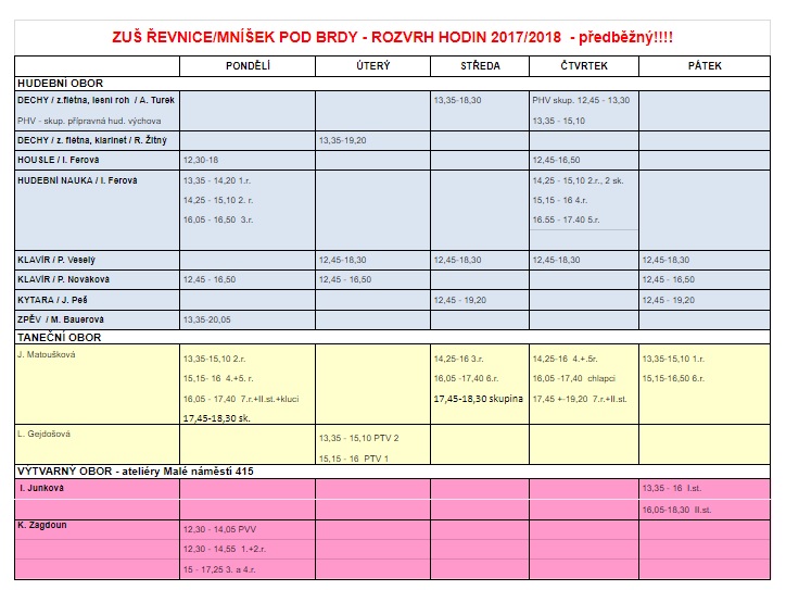 Třídní schůzky pedagogů se konají v jejich první výukový den (dle rozpisů). Od dalšího výukového dne jednotlivých pedagogů již probíhá výuka. Podrobnosti k výuce a vše potřebné se dozvíte na třídních schůzkách. Účast rodičů nutná.