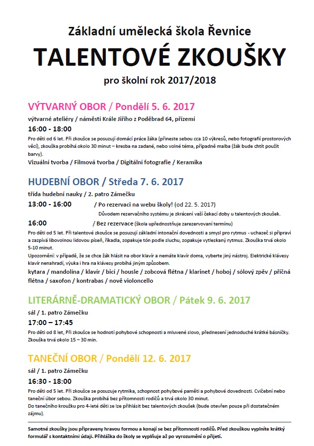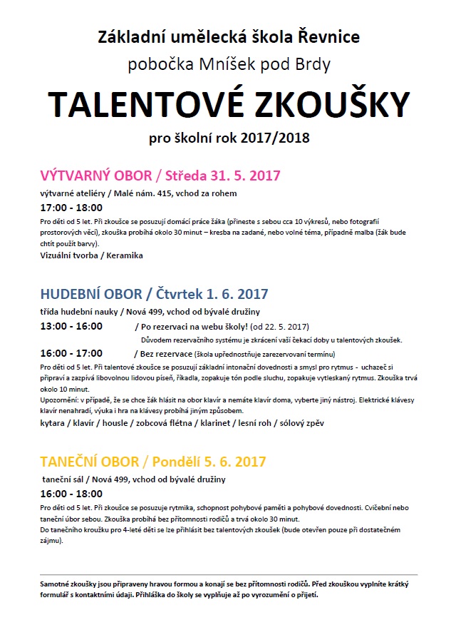 Rozpis konání talentových zkoušek v Řevnicích a Mníšku pod Brdy